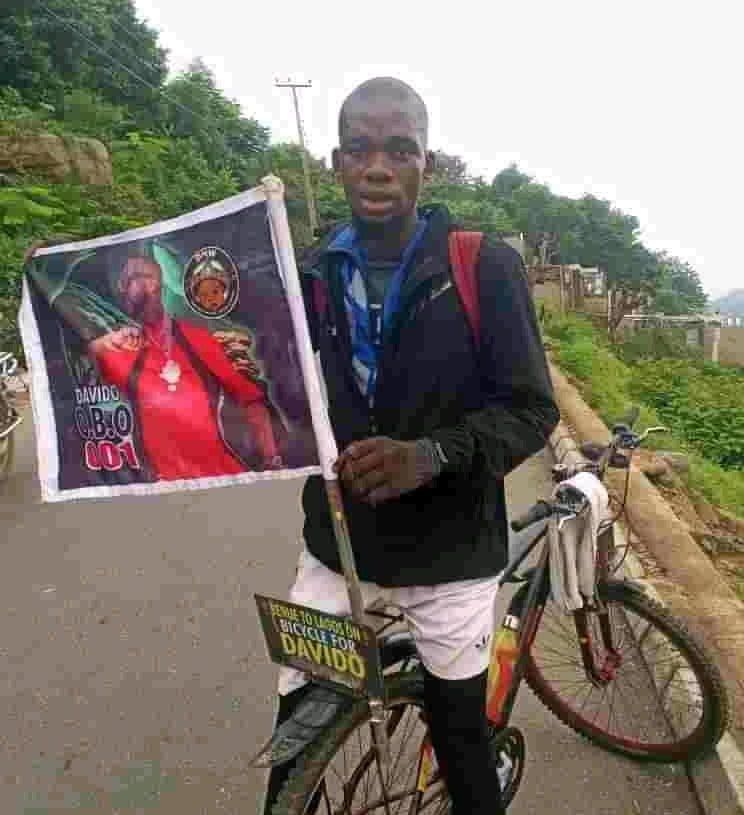 A Twitter user, @ssbbmuzi had shared photos of the fan with the handle @emmiwuks, saying he had been riding a bicycle from Benue to meet Davido.