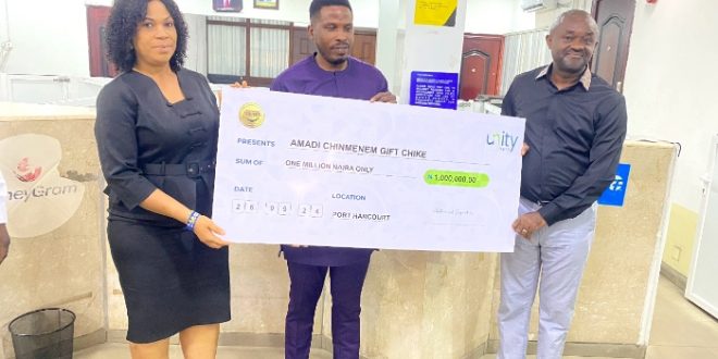 A Unity Bank buyer, Mr. Amadi Chinmenem Present Chike, has emerged as the most recent winner of One Million Naira within the ongoing Money Rewards Promo by Unity Bank Plc and CashToken Rewards Africa. CashToken Rewards Africa is a Money-Reward-as-a-Service firm that rewards clients for his or her patronage and loyalty.