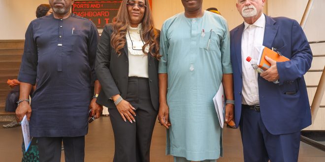 L-R: Senator Kelvin Chukwu, Senator representing Enugu East; Mrs Wunmi Eniola-Jegede, Group Coordinating Director, SIFAX Group; Senator Sunday Marshall Katung, Chairman Home Committee on Privatisation and Mr. John Jenkins, Managing Director, Ports & Cargo dealing with providers in the course of the Home Committee’s oversight go to to Ports & Cargo Dealing with Service Terminal in Lagos.