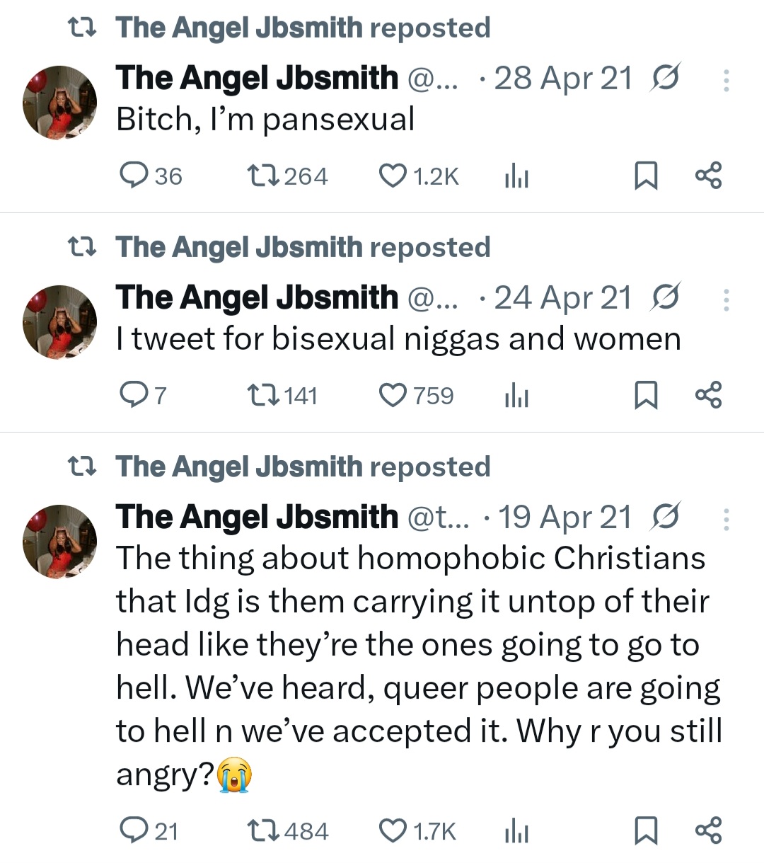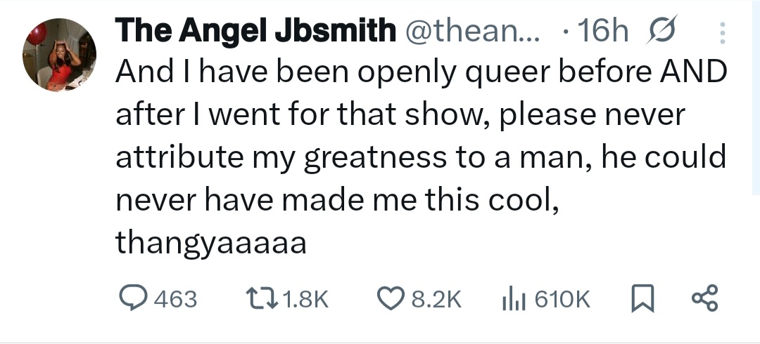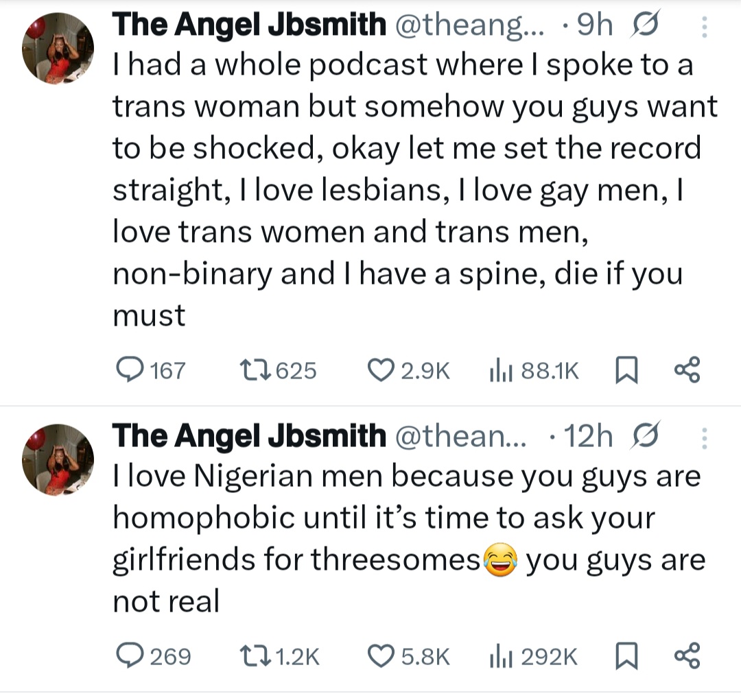 She wrote: “I love Nigerian men because you guys are homophobic until its time to ask your girlfriends for thresomes. you guys are not real.”Angel went on to share tweets she made back in 2021 in which she identified as queer. See below.
