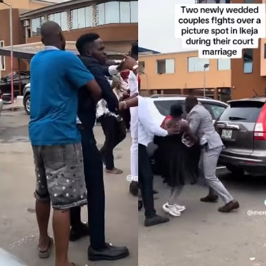 A video showing the moment two men who just got married exchanged blows at a marriage registry in Lagos state over picture spot has made the rounds on social media.