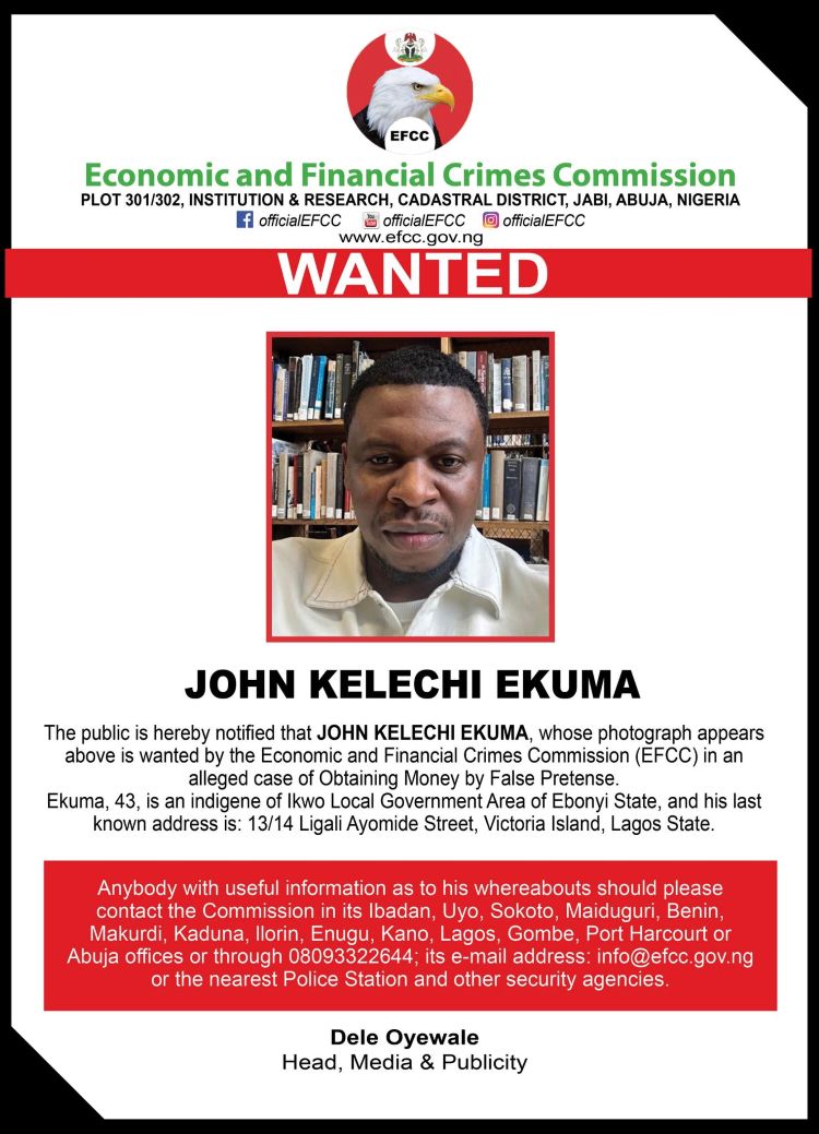 The Economic and Financial Crimes Commission (EFCC) has declared one John Kelechi Ekuma wanted over an alleged case of obtaining money by false pretence.