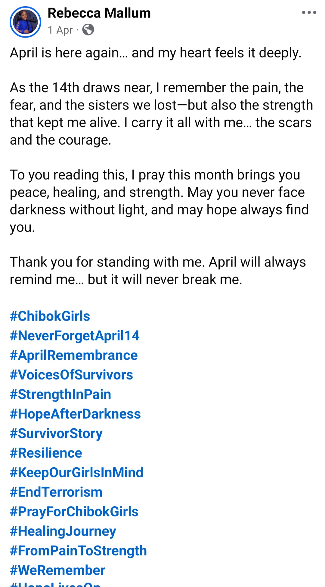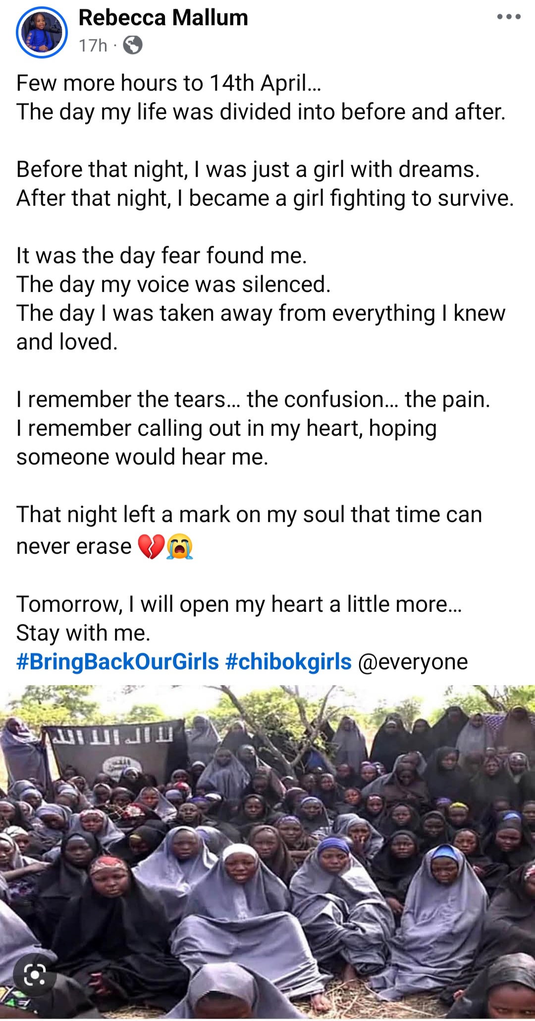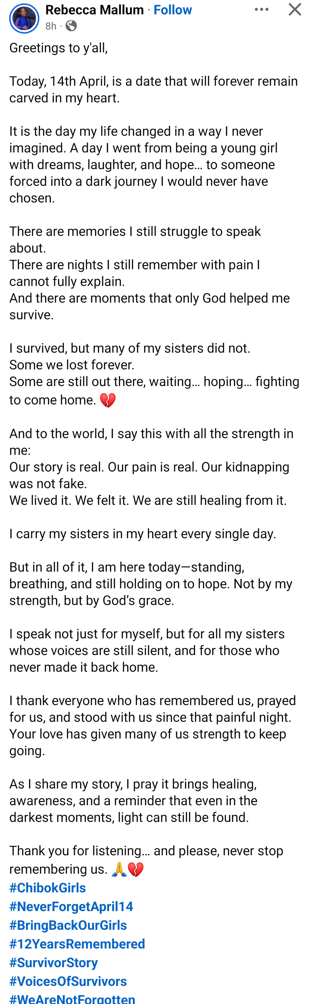 Rebecca Mallum, a survivor of the Chibok school kidnapping in 2014, has remembered her colleagues on the 12th anniversary of their abduction.