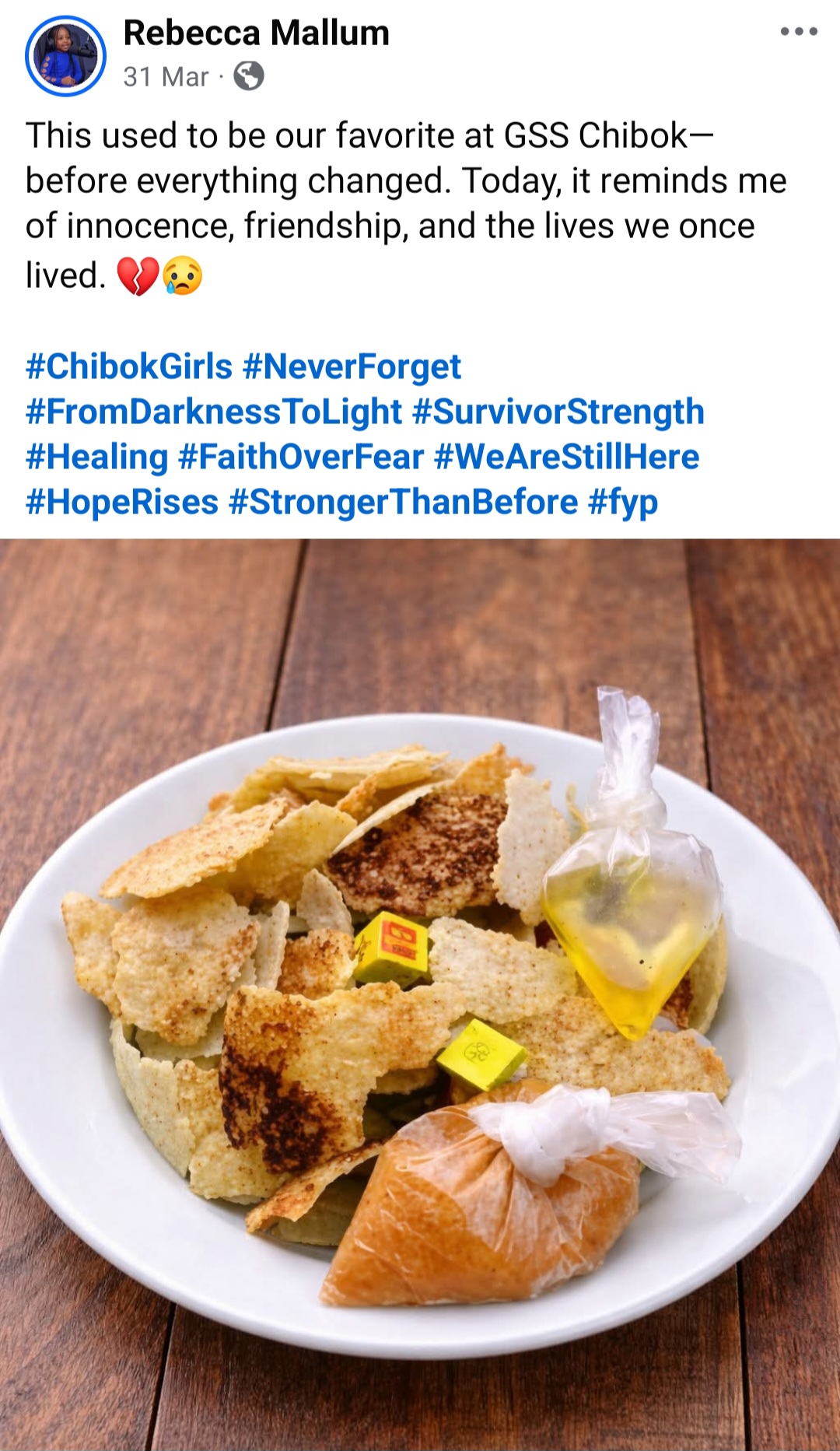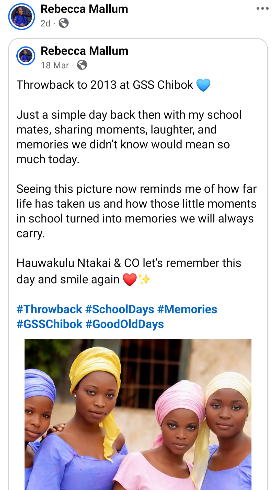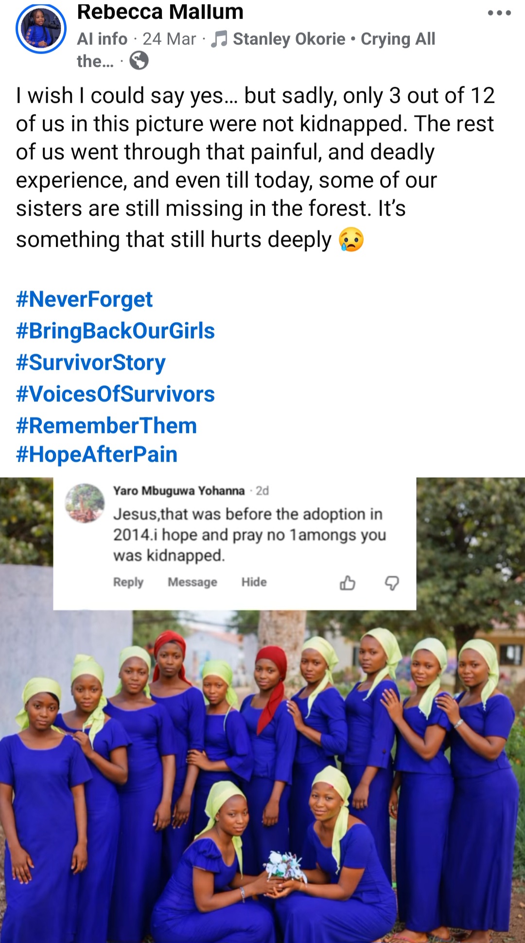 Rebecca Mallum, a survivor of the Chibok school kidnapping in 2014, has remembered her colleagues on the 12th anniversary of their abduction.