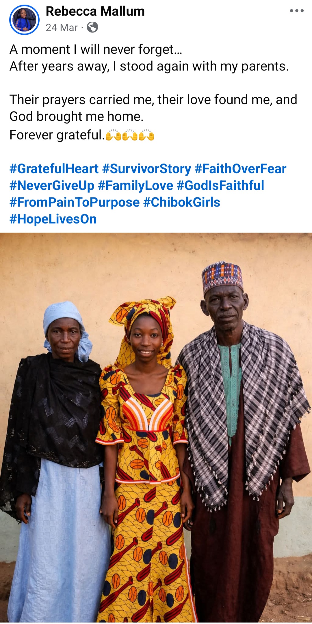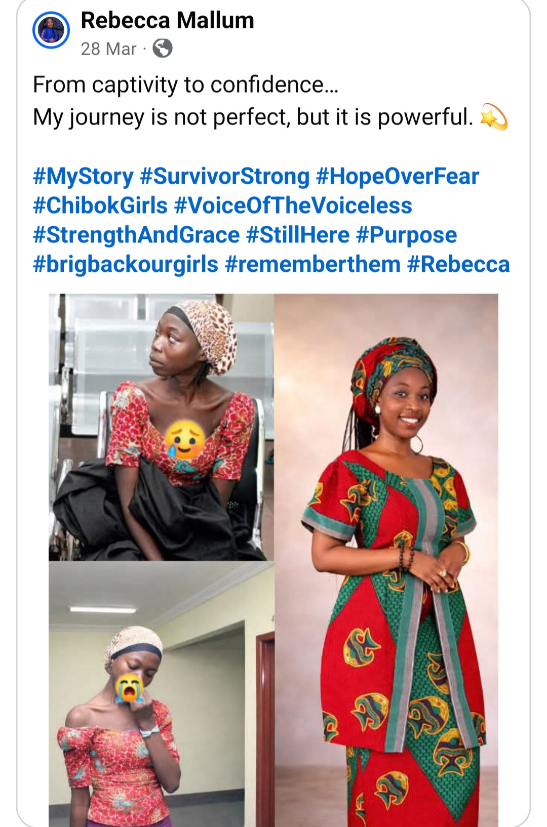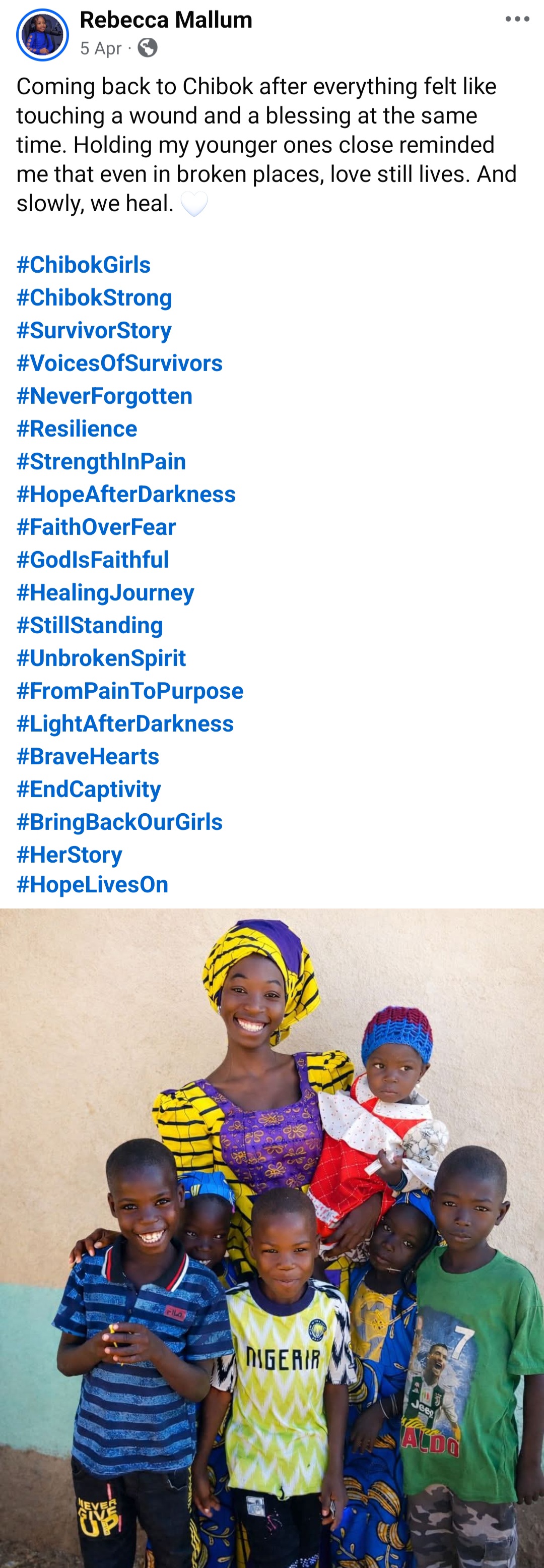 Rebecca’s Facebook page is dedicated to remembering victims of kidnappings and insecurity in Northern Nigeria. She also writes about her experience as a survivor.