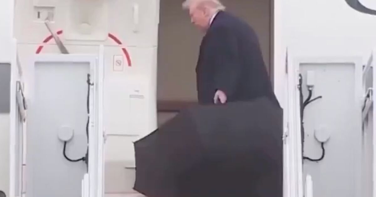 Another said: “Donald Trump is getting mocked after video shows him walking away without even closing his own umbrella before boarding the plane.