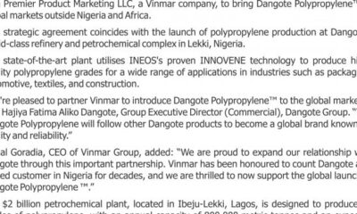 …Targets $1.2 billion turnover yearly Dangote Petroleum Refinery and Petrochemicals FZE has introduced an unique partnership with Premier Product Advertising LLC, a Vinmar...
