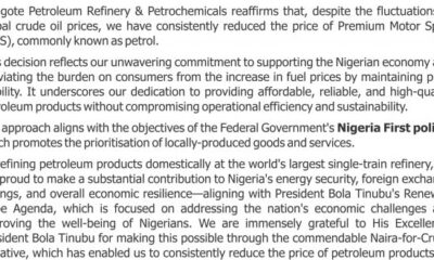 Dangote Petroleum Refinery & Petrochemicals reaffirms that, regardless of the fluctuations in world crude oil costs, it has persistently decreased the value of...