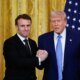 US President Donald Trump and French President Emmanuel Macron shake hands at the end of a joint press conference in the East Room to the White...