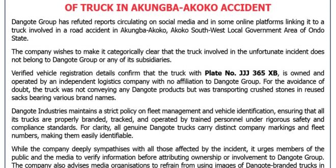 Dangote Group has refuted stories circulating on social media and in some on-line platforms linking it to a truck concerned in a...
