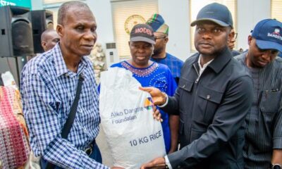 …while Aliko Dangote Foundation distributes rice to host communities in Okpella. Deputy Governor of Edo State, Hon. Dennis Idahosa (second from right) presents...