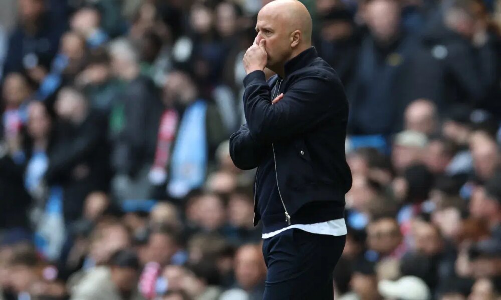 Liverpool’s Dutch manager Arne Slot looks on during the English FA Cup quarter final football match between Manchester City and Liverpool at the Etihad Stadium in...
