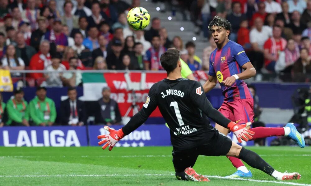 Barcelona’s Spanish forward #10 Lamine Yamal attempts to score during the Spanish league football match between Club Atletico de Madrid and FC Barcelona at Metropolitano Stadium...